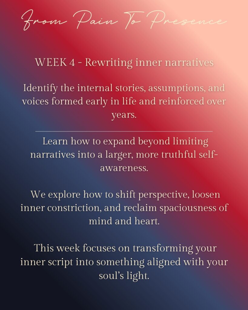 Identifying inherited stories and internal voices, and learning how to expand beyond them into clarity, authenticity, and inner spaciousness.